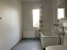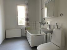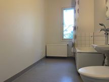 - Pesutilojen varusteet: Pesukoneliitäntä, wc-istuin, suihku, kylpyamme ja allaskaappi. Pesutilojen kuvaus: Tilava kylpyhuone jonne pesukone mahtuu helposti.