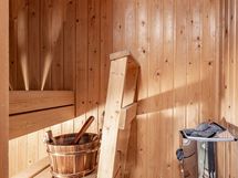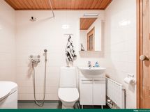 - Kylpyhuone: wc-istuin (vaihdettu 2026), allaskaappi, allas, hana, peilikaappi, suihku, kisko suihkuverholle, pesukoneliitäntä. Sauna: sähkökiuas (2021), lauteet. . Lattia: Muovi. Seinät: Laatta