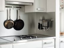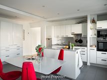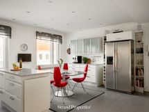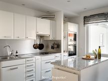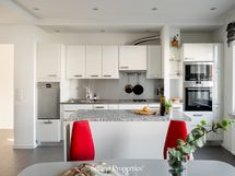 - Suuri, vuonna 2012 uudistettu keittiö, jossa on runsaasti tilaa ruokapöydälle sekä ruhtinaallisesti säilytystilaa. Yhdellä seinällä on valkoiset kaapistot, rosterinen välitila sekä rosterinen allas ja työtaso. Keittiössä on kapea astianpesukone nostettuna käyttökorkeudelle, kaasuliesi ja iduktioliesi. Liesituuletin on liitetty hormiin. Kalusteuuni ja -mikro on sijoitettu käyttökorkeudelle. Saarekkeessa on kivitaso, runsaasti säilytystilaa sekä klaffi-apupöytä.
