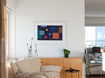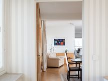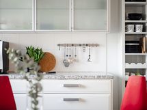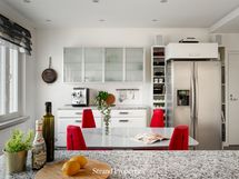 Vastakkaisella seinällä sijaitsee kaksiovinen jääkaappi–pakastin jääpalakoneella. Lisäksi seinällä on viinihylly, huurrelasiset yläkaappien ovet sekä valkoiset laatikostot kivitasolla.