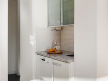 Keittiön ja ruokailutilan välissä sijaitsee pieni apukeittiö, jossa on täysikokoinen astianpesukone, pieni allas ja hana, sekä korkea viinikaappi. Yläkaapeissa on huurrelasiovet, alakaapissa valkoinen ovi ja kivitaso.