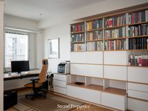 Kolmannella seinällä on suuret kaapistot valkoisilla ovilla.