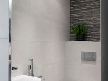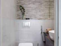 Erillinen WC-tila jossa seinämallinen wc-istuin, pieni allas, hana, sekä bidee-suihku.