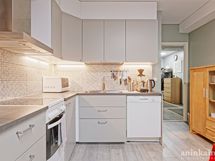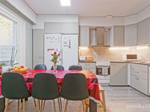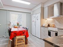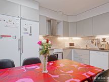 - Varusteet: jääkaappi, pakastin, astianpesukone. Työtaso: laminaattitaso. Liesi: keraaminen liesi, liesituuletin hormilla. Ajattomat vaaleanharmaat keittiönkaapit. Erilliset jää- ja pakastinkaapit, hormiin menevä rosterinen liesituuletin, keraaminen liesi, astianpesukone. Tilavaan keittiöön mahtuu isompikin ruokapöytä.