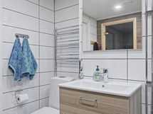 - Varusteet: WC, suihku, kiinteät valaisimet, pesukoneliitäntä, allaskaappi, peili. Tyylikkäästi remontoidussa kylpyhuoneessa on uusittu käyttövesiputket, laatoitus ja kalustus. Led-valaistus upotettuna kattopaneeleihin. WC: Wc on kylpyhuoneen yhteydessä. Varusteet: lattiaan asennettu WC, bidee