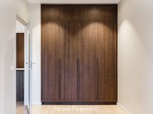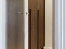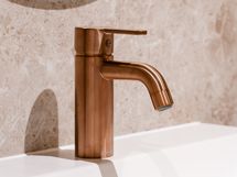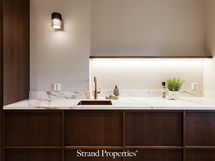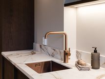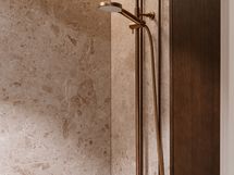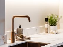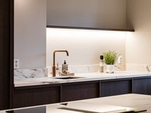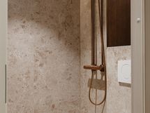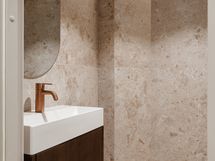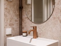 Kylpyhuone jatkaa kodin hienostunutta linjaa. Epäsuora valaistus, Wooden valmistamat mittatilauskalusteet ja huolella valitut laatoitukset tuovat arkeen ripauksen spa-tunnelmaa.