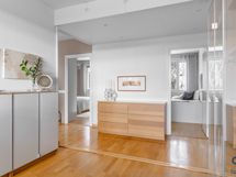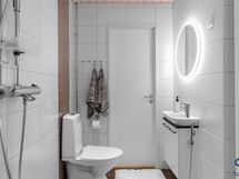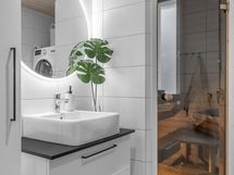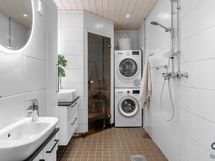 - Pesutilojen kuvaus: Kokonaan laatoitettu, suihku, kaksi pesuallasta, wc-istuin, pesukoneliitäntä, tilaa kuivausrummulle.