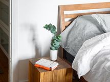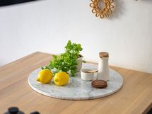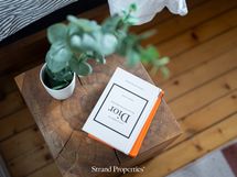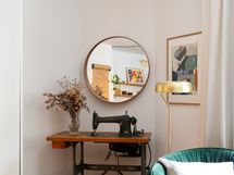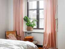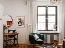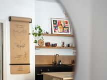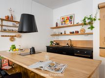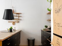 - Vuonna 2018 uusittu avokeittiö, jonka alakaapistossa tummat laatikot, tumma tasoon upotettu allas, messinkihana ja -vetimet, seinällä avohyllyt.