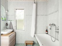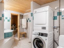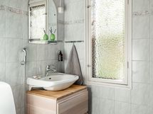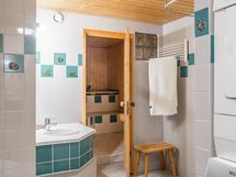 Pesutilojen varusteet: Suihkuseinä, kylpyamme, peili, allaskaappi, pesukoneliitäntä ja lattialämmitys.