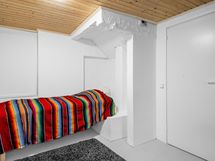 Yhdessä makuuhuoneessa lattia laminaattia ja seinässä sisustuslevy, toisessa lattia laminaattia ja seinät maalattu.