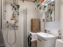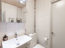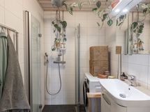 - Pesutilojen varusteet: WC-istuin, suihku, suihkuseinä, lattialämmitys, pesuallas, allaskaappi, peilikaappi ja pesukoneliitäntä.