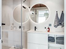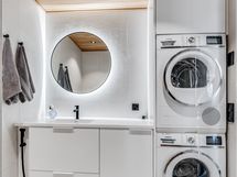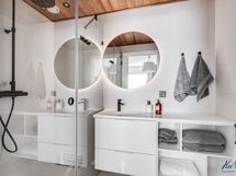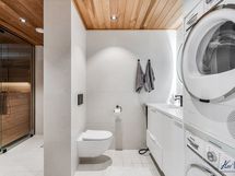 - Pesutilojen varusteet: WC-istuin, suihku, suihkuseinä, pesukoneliitäntä, peili, allaskaappi ja bidee-suihku. Pesutilojen kuvaus: Kaksi kylpyhuonetta, joissa molemmissa suihku sekä wc, ja toisen kph:n yhteydessä on myös sauna. Erillisten WC:n lukumäärä: 1. Erillisen WC:n varusteet: WC-istuin, suihku, allaskaappi, peili, bidee-suihku ja lattiakaivo.