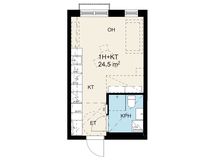Tässä tehokkaassa yksiössä neliöt on hyödynnetty viisaasti. Avoin keittiö ja oleskelutila muodostavat ilmavan kokonaisuuden, jota täydentää valoa antava suuri ikkuna ja ranskalainen parveke. Tilavassa kylpyhuoneessa on varaus pyykinpesukoneelle.
