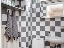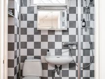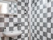 - Varustus: suihkuseinä, pesukoneliitäntä, wc-istuin, suihku, peilikaappi.