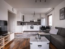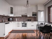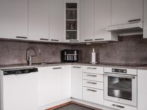 - Jääkaappipakastin, erillisuuni, keraaminen liesi, liesituuletin, astianpesukone, kaapistot, kiinteät valaisimet.