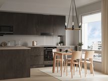 kalusteeseen asennettu. Kalustepeitteisiä kylmälaitteita on asunnossa yksi (jääkaappipakastin). Asunnossa A32 on erillinen jääkaappi ja erillinen pakastinkaappi. Keittiökalusteiden välitilassa on LED-nauhavalaisin. Kalusteissa on 600 mm leveä astianpesukone. Pistorasia on välitilassa.