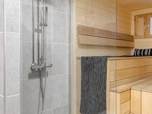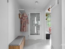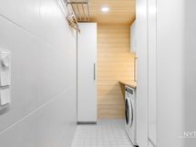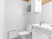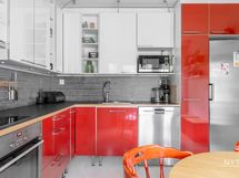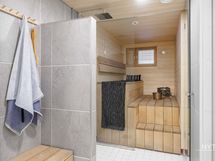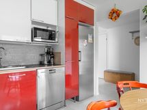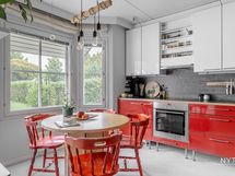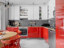 Keittiö on saanut uuden ilmeen vuonna 2008. Punaisen ja valkoisen yhdistelmästä muodostuva keittiö on nykyaikainen ja vastaa tämän päivän varustelutasoa. Keittiön kaapit, tasot, runko ja välitila ovat kaikki hyvässä kunnossa. Kylpyhuone on näyttävä, vuonna 2016 uusittu kokonaisuus. Sauna on kauniisti paneloitu ja lasiseinän myötä avaranoloinen löylyhuone. Kylppärissä erillinen osa kodinhoitohuoneelle, josta löytyy pesukoneliitännän lisäksi myös kaappi- ja tasotilaa erinäisiin askareisiin ja säilyttämiseen. Alakerrassa asunnon ensimmäinen erillinen wc.