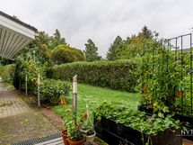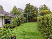 Piha-alue on pääosin nurmikkoista ja sisältää istutuslaatikoita ja pensaita. Asuntoon kuuluu sähköpistokkeellinen autokatospaikka ja tämän lisäksi pihalla on tilaa myös toisen auton pysäköintiin. Katoksen yhteydessä kylmä ulkovarasto.