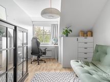 Yläkerrasta löytyy kaksi makuuhuonetta, asunnon toinen erillinen wc, sekä varastohuone. Molemmat makuuhuoneet on varusteltu kiinteillä kaapistoilla. Varastohuone tarjoilee kattavasti tilaa säilyttämiseen ja varastointiin. Asunnossa kaksi ilmalämpöpumppua lämmitykseen ja viilennykseen. Ilmanvaihto tapahtuu koneellisesti huippuimurin kautta. Huoneistoon asennetaan valokuitu vuoden 2026 aikana.