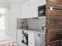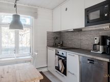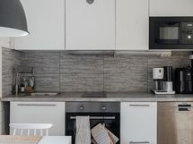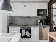 Keittiön varusteet: Jääkaappipakastin, erillisuuni, liesituuletin, uuni ja astianpesukone. Liesi: Induktioliesi. Työtason materiaali: Laminaatti.