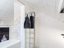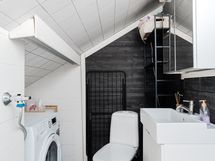 Pesutilojen varusteet: WC-istuin, suihku, pesukoneliitäntä, lattialämmitys, pesuallas ja allaskaappi.