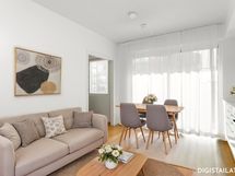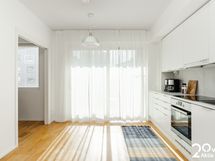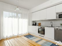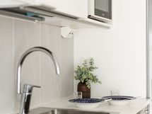 - Liesi: induktio. Työtasot: laminaatti. Kylmäsäilytys: jääkaappi/pakastin. Varustus: liesituuletin, mikroaaltouuni, astianpesukone, kiinteät valaisimet. Keittiö ja olohuone yhteistä ja avaraa tilaa. Tilaan mahtuu sohva ja ruokailuryhmä.