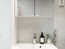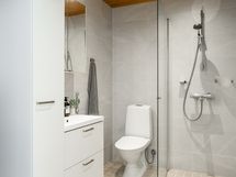 - Pesutilojen kuvaus: bidee suihku. Varustus: suihkuseinä, pesukoneliitäntä, lattialämmitys, wc-istuin, suihku, peilikaappi, kiinteät valaisimet, kylpyhuonekaapisto.