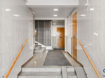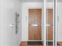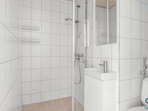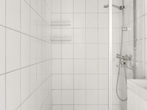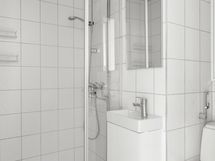 - Pesutilojen kuvaus: Seinät ja lattia laattaa. Suihku, suihkuseinä, peili, pesuallas, allaskaapisto, wc-istuin, kaapisto.