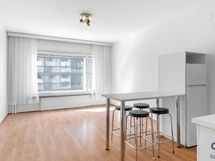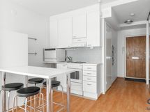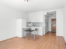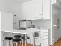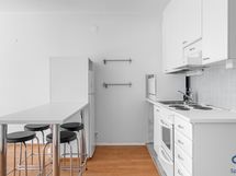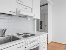 - Astianpesukone, jääkaappi ja sähköliesi. Keittiössä tilavaraus pyykinpesukoneelle. Vaaleat kaapistot, välitila laattaa, laminaattilattia, seinät maalatut.