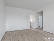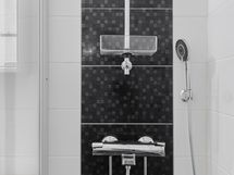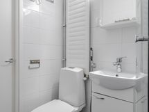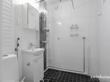- Kylpyhuone on saneerattu 2017: nykyaikaiset vesieristeet, suihku, lasinen suihkuseinä, allaskaappi, peilikaappi, wc-istuin, bidee, pyykinpesukoneen liitännät. Kylpyhuoneen hanat on uusittu putkiremontin yhteydessä 2023. Seinät isoa valkoista laattaa, lattia tummanharmaata laattaa.