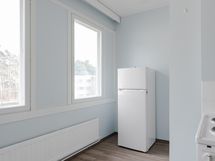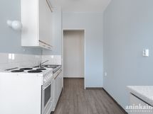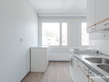 - Tilava L:n mallinen keittiö, jonka perällä on ruokailutila. Keittiössä on liesi, pieni jääkaappi/pakastin, irtokaappi ja kiinteä valaistus. Kaapiston välitila laatoitettu, seinät maalattu, lattia laminaattia.