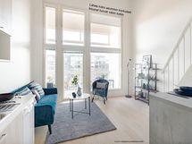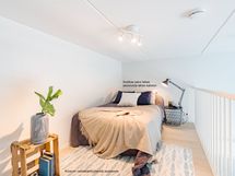 Sijaitsen neljännessä, eli ylimmässä kerroksessa. Olen yksiö, mutta minussa erikoista on upea loft-tyylinen parvi, joten saat minusta käytännössä kaksion yksiön hoitovastikkeella. Huonekorkeuteni on yli 4 metriä! Parvi on kooltaan 8m2.