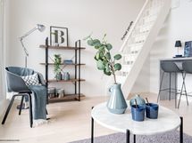 P.S. Valokuvat, joissa on kalusteita, ovat vastaavan tyylisestä asunnosta (keittiö eri kohdassa ja portaat jyrkemmät).