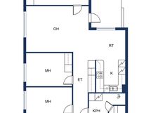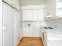 - Keittiön varusteet: Astianpesukone, jääkaappi, liesi, erillinen pakastin, liesituuletin ja kiinteät valaisimet. Työtason materiaali: Laminaatti.