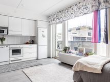 - Hyvän kokoinen keittiö, jossa runsaasti kaappi- ja laskutilaa. Varustus: jääkaappi/pakastin, astianpesukone, liesituuletin / hormi. Liesi: induktio, erillisuuni. Lattia: laminaatti. Seinät: maalattu.