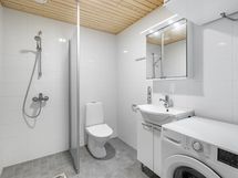 - Pesutilojen kuvaus: Tilava kylpyhuone, jonne sovitat helposti vaikka pesutornin. Varustus: suihkuseinä, pesukoneliitäntä, lattialämmitys, wc-istuin, suihku, peilikaappi, kiinteät valaisimet, kylpyhuonekaapisto. Lattia: laatta. Seinät: kaakeli.