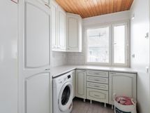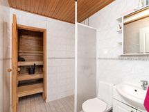 - Sauna, sähkökiuas alkuperäinen, toimii, kylpyhuone peili- ja allaskaappi sekä wc-istuin., erillinen wc peili- ja allaskaappi., suihku, suihkuseinä, pesukoneliitäntä khh, lattialämmitys sähköinen lattialämmitys kaikkialla. Kodinhoitohuoneessa on varaaja, kaapistoja reilusti ja työskentelytasoa.
