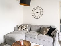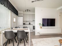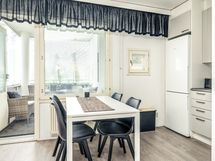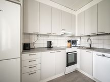 - Keittiön varusteet: Jääkaappipakastin, liesi (keraaminen), astianpesukone ja liesituuletin. Työtason materiaali: Laminaatti.