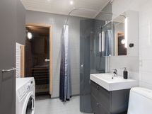- Pesutilojen varusteet: WC-istuin, suihku, suihkuseinä, pesukoneliitäntä, peilikaappi, pesuallas ja allaskaappi. Pesutilojen kuvaus: Kylpyhuone on tilava ja hyväkuntoinen sekä siisti. Kaapistot suihkuseinä, pesuallas uusittu v.2022.