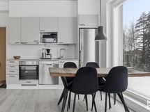 Avokeittiö on varustettu nykyaikaisilla kodinkoneilla, kuten jääkaappi-pakastimella, astianpesukoneella ja keraamisella liedellä – kaikki valmiina sujuvaan arkeen. Kylpyhuoneessa on miellyttävä lattialämmitys sekä tilavaraus pesukoneelle.