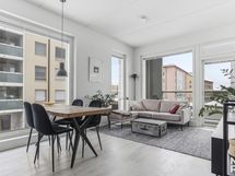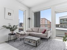 Kolmannen kerroksen 33,5 m² asunto on suunniteltu fiksusti: pohjaratkaisu on kompakti mutta yllättävän toimiva, ja suuret ikkunapinnat tuovat tilaan runsaasti luonnonvaloa. Kokonaisuus tuntuu neliöitään suuremmalta.