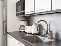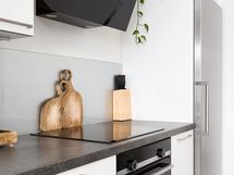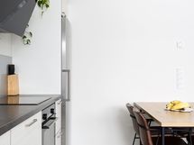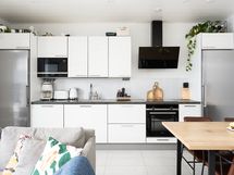 - Keittiön varusteet: Jääkaappi, erillinen pakastin, astianpesukone, erillisuuni, liesi, mikroaaltouuni ja liesituuletin. Liesi: Induktioliesi. Työtason materiaali: Laminaatti.
