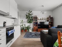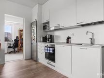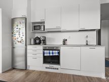 - Keittiön varusteet: Jääkaappipakastin, liesi, liesituuletin, erillisuuni ja astianpesukone. Liesi: Keraaminen liesi. Työtason materiaali: Laminaatti.