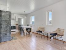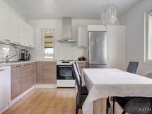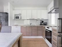 - Puustellin kaapistot, työtasot, pesuallas, jääkaappi/pakastin, sähköliesi ja -uuni , apk-liitäntä, liesituuletin (suodatin). Lattia laminaatti, lattalämmitys.
