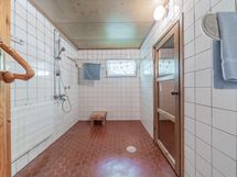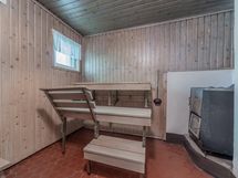 Reilunkokoinen kylpyhuone ja puulämmitteinen sauna, molemmissa ikkunat.