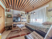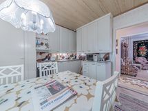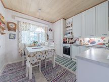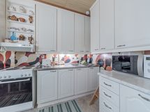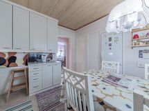 Valoisaan olohuoneeseen on asennettu vuonna 2017 ilmalämpöpumppu. Kodikas keittiö, jossa paikka ruokapöydälle.