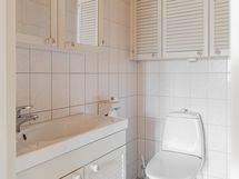 - Varusteet: suihku, peilikaappi, allaskaappi, WC, lattialämmitys. WC: Yksi erillinen wc eteisaulassa, yksi wc/pesuhuone kahden makuuhuoneen välissä, yksi wc kylpyhuoneen yhteydessä. Varusteet: lattiaan asennettu WC, bidee, peilikaappi, allaskaappi