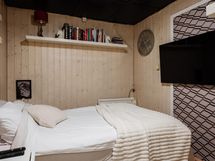 Keittiössä on jääkaappipakastin ja kaasuliesi, ja olohuoneessa muovimatto ja paneloidut seinät luovat kodikkaan tunnelman.