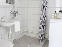- Pesutilojen kuvaus: Suihku, peilikaappi, pesuallas, wc-istuin, bideesuihku, pesukoneliitäntä. Lattia ja seinät laatta.