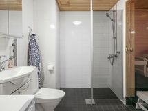 - Suihku, Pesukoneliitäntä, Vesikiertoinen lattialämmitys, Tilaa pesukoneelle, Käsisuihku, Kaapisto, Allas, WC-istuin, Peilikaappi